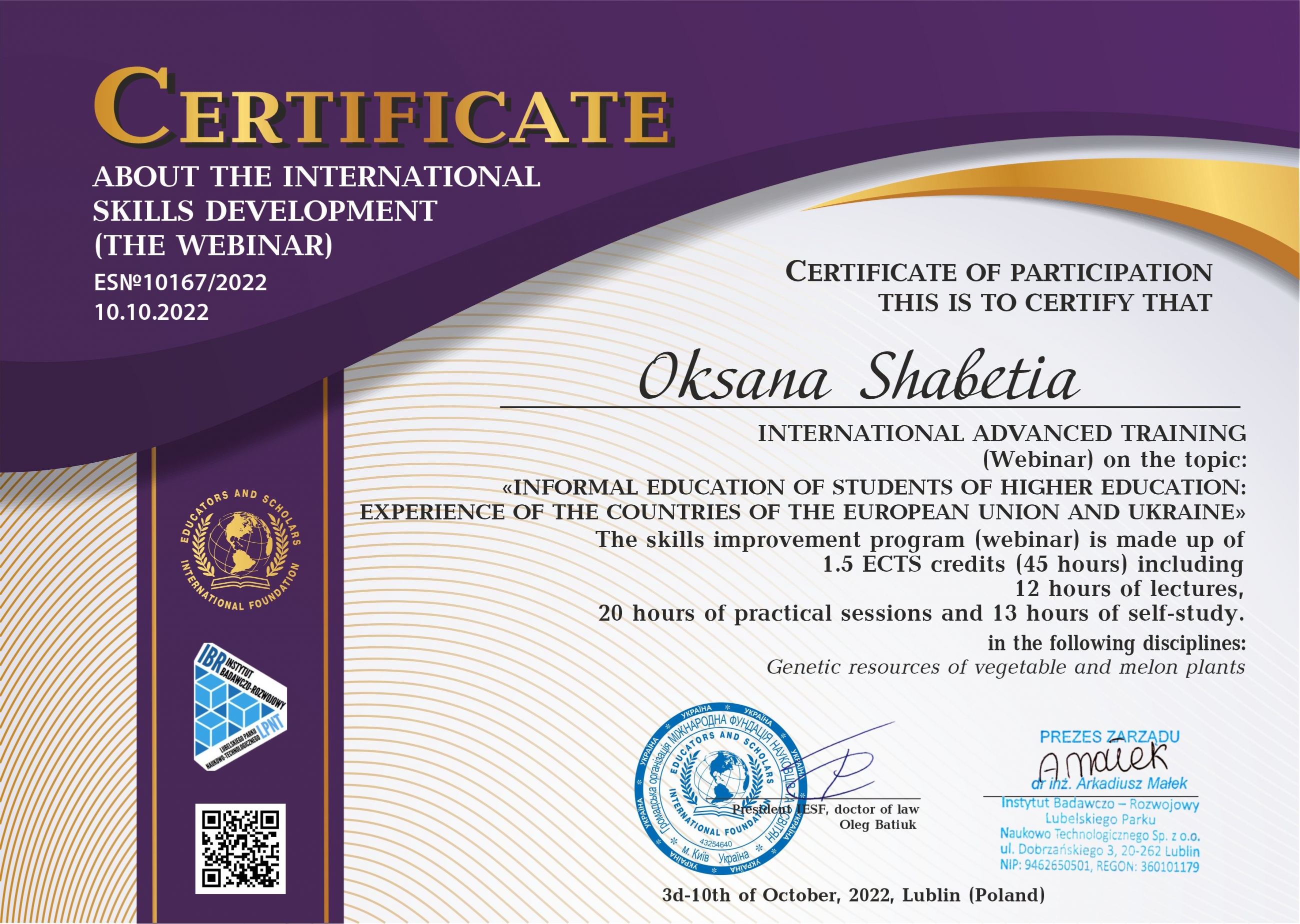 З 3 по 10 жовтня 2022 р. співробітники інституту доктори с.-г. наук Сергієнко Оксана Володимирівна, Шабетя Оксана Миколаївна, кандидат с.-г. наук Щербина Сергій Олександрович прийняли участь в режимі онлайн у міжнародному підвищенні кваліфікації (вебінарі) на тему: «INFORMAL EDUCATION OF STUDENTS OF HIGHER EDUCATION: EXPERIENCE OF THE EUROPEAN UNION AND UKRAINE», яке відбулося в м. Люблін (Республіка Польща).