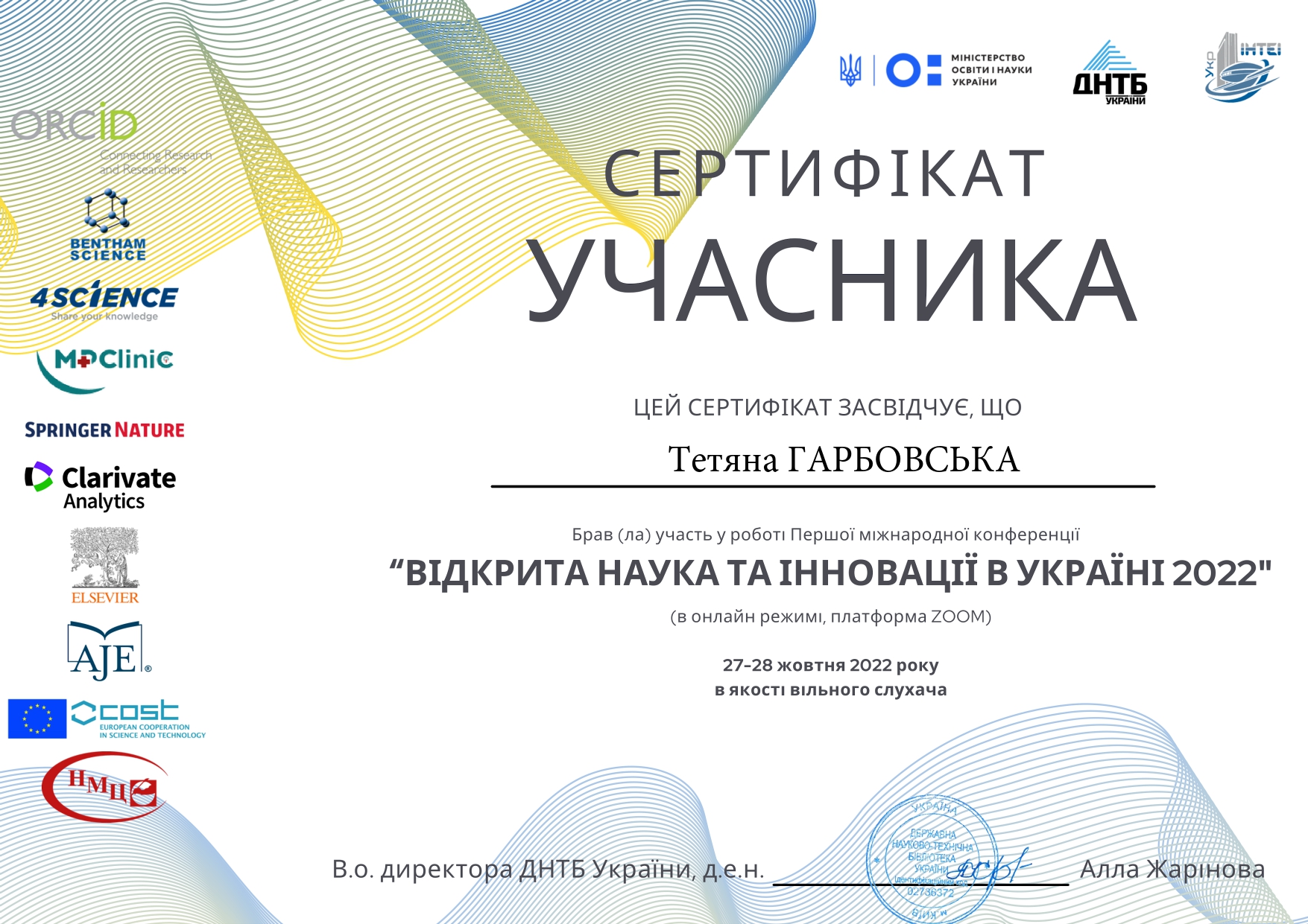27-28 жовтня 2022 року співробітник інституту Гарбовська Т.М. прийняла участь в режимі онлайн в якості вільного слухача в Першій міжнародній конференції «Відкрита наука та інновації в Україні 2022» (OSICU2022).