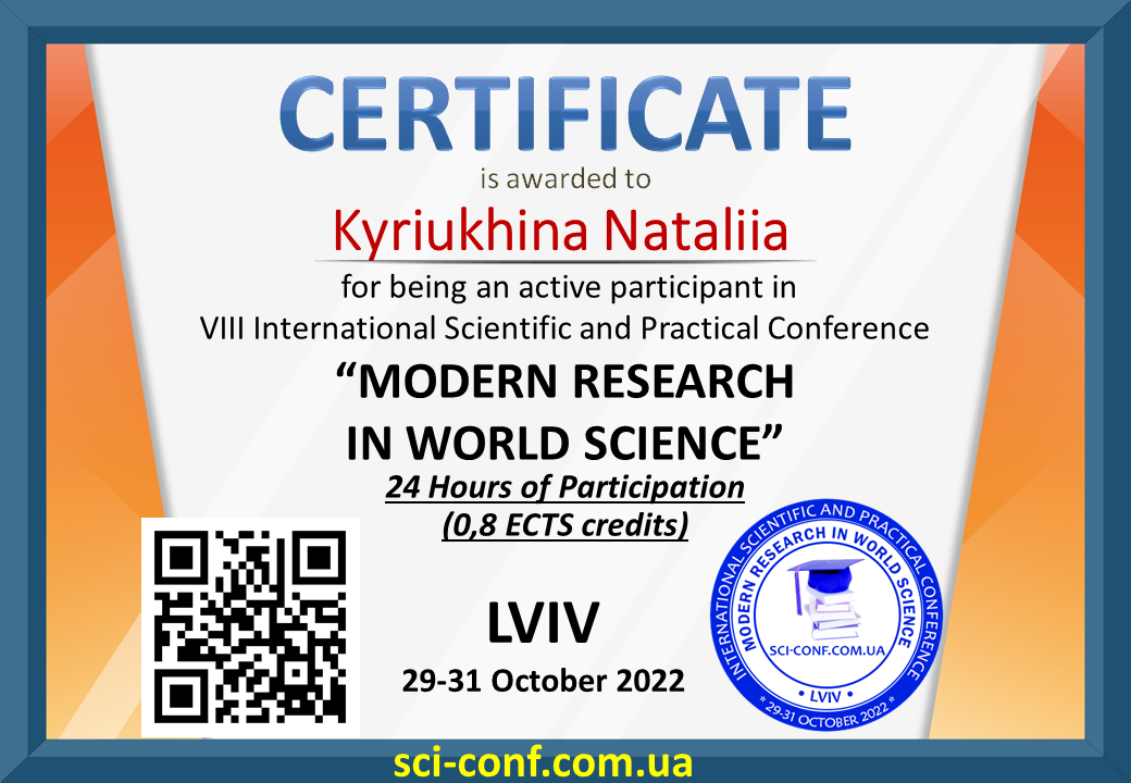 29-31 жовтня 2022 року кандидат с.-г. наук Кирюхіна Наталія Олександрівна прийняла участь у VIII Міжнародній науково–практичній дистанційній конференції «MODERN RESEARCH IN WORLD SCIENCE», яка відбулася у м. Львів.