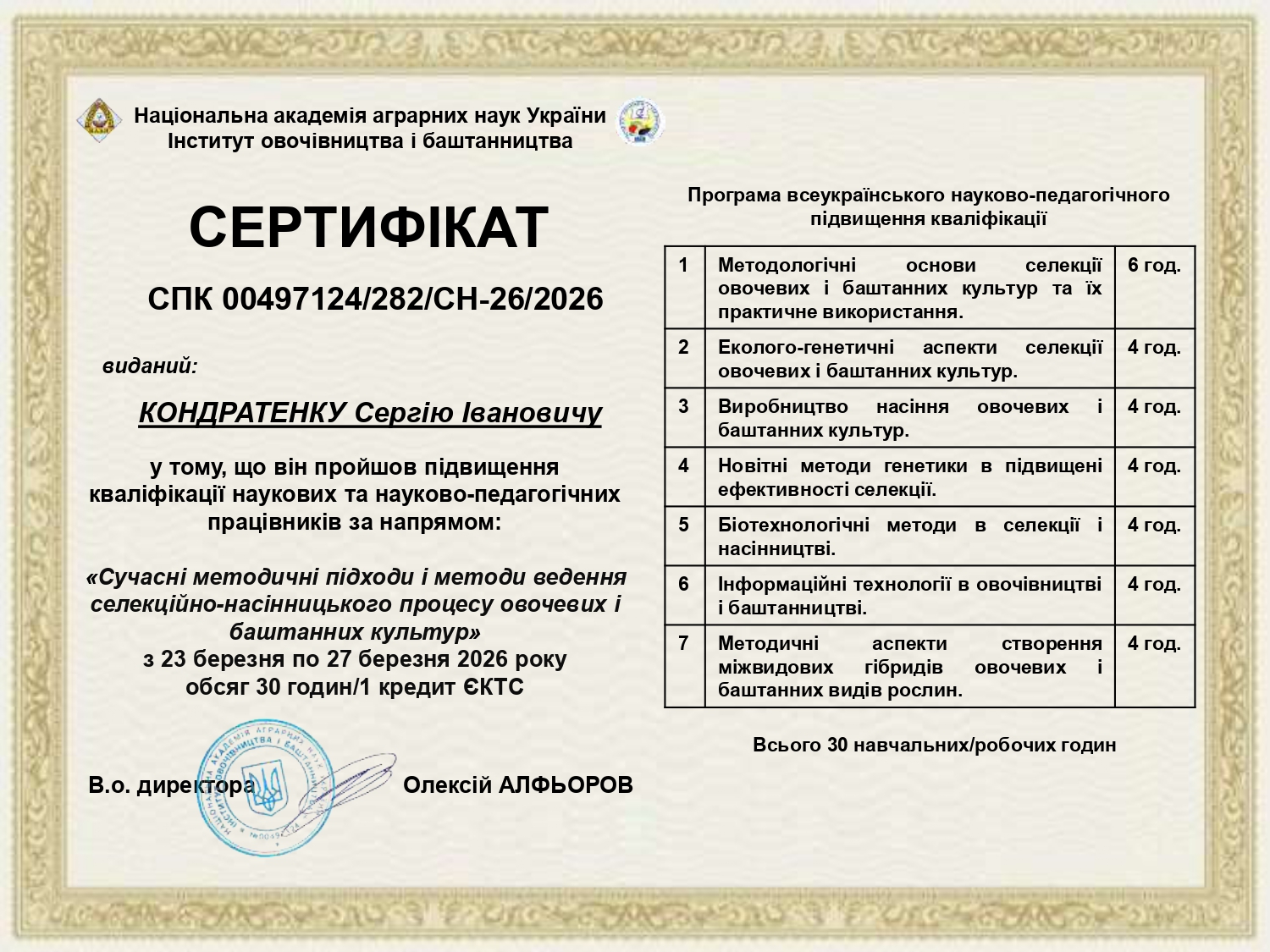 Kondratenko Serhii IvanovychDr. Sci (Agr.), specialty - selection and seed production, Senior Researcher