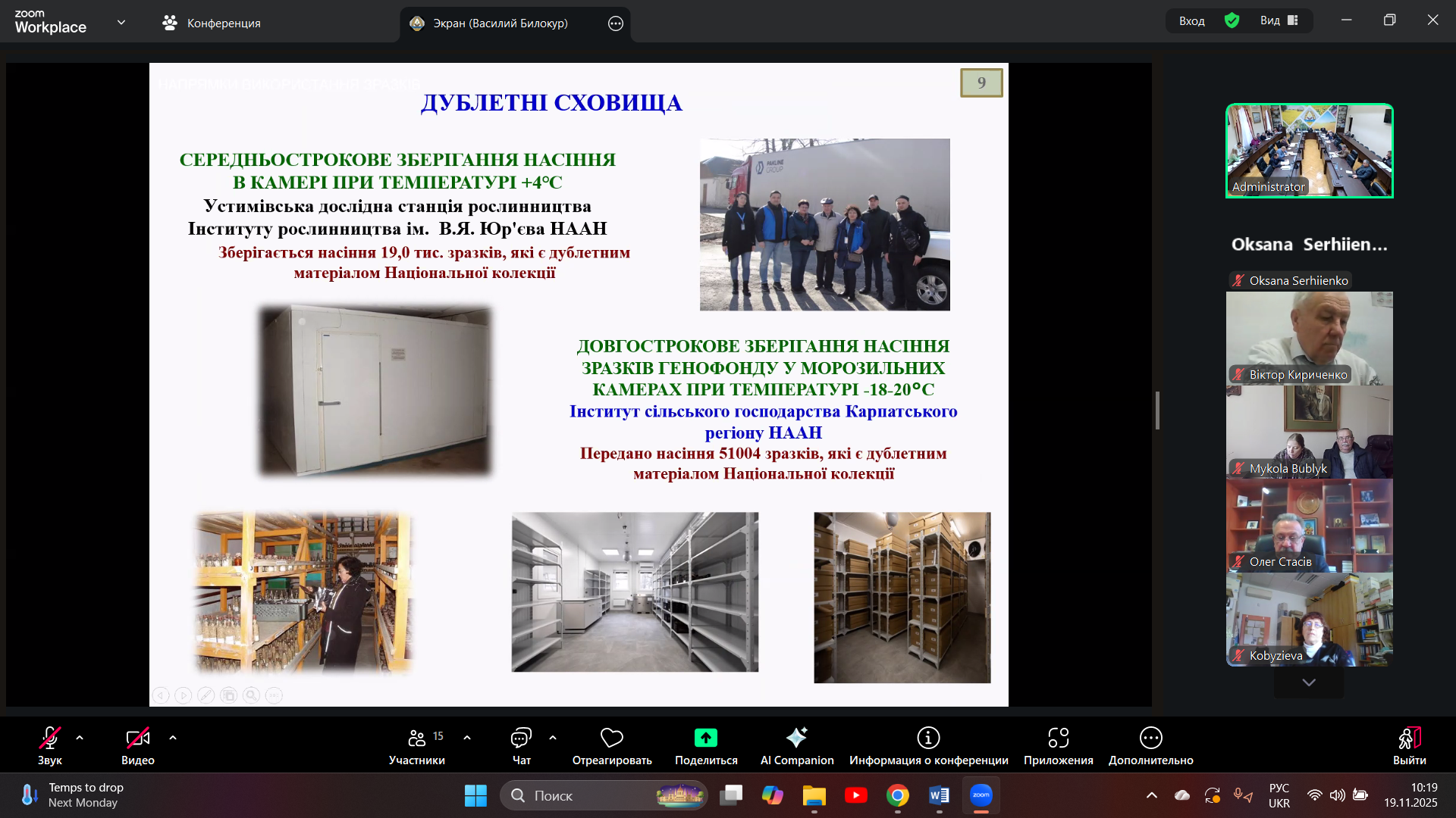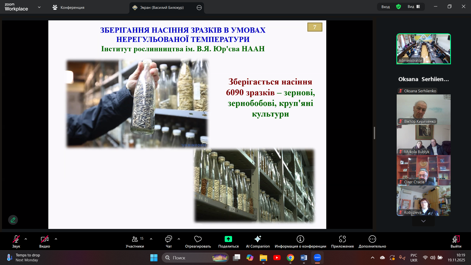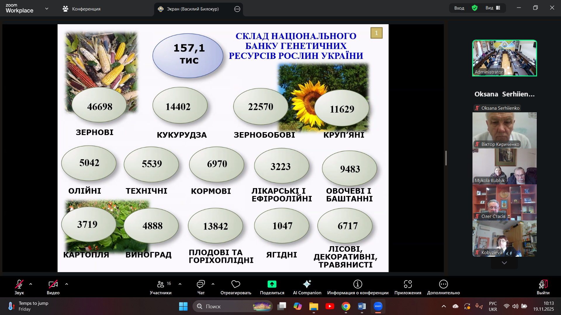 On November 19, 2025, Deputy Director for Scientific Work, Doctor of Agricultural Sciences Oksana Volodymyrivna Sergienko took part in a meeting of the Presidium Bureau of the National Academy of Agrarian Sciences, which considered the following issue: “Organization of the effective use of genetic resources” (speaker: Viktor Kuzmich Ryabchun, Candidate of Biological Sciences, Deputy Director for Scientific Work with Plant Genetic Resources at the V. Ya. Yuriev Institute of Plant Growing of the NAAS). The Presidium Bureau considered topical issues regarding their effective replenishment and conservation for use in agricultural crop breeding programs to ensure biodiversity and, in the future, food security for humanity.