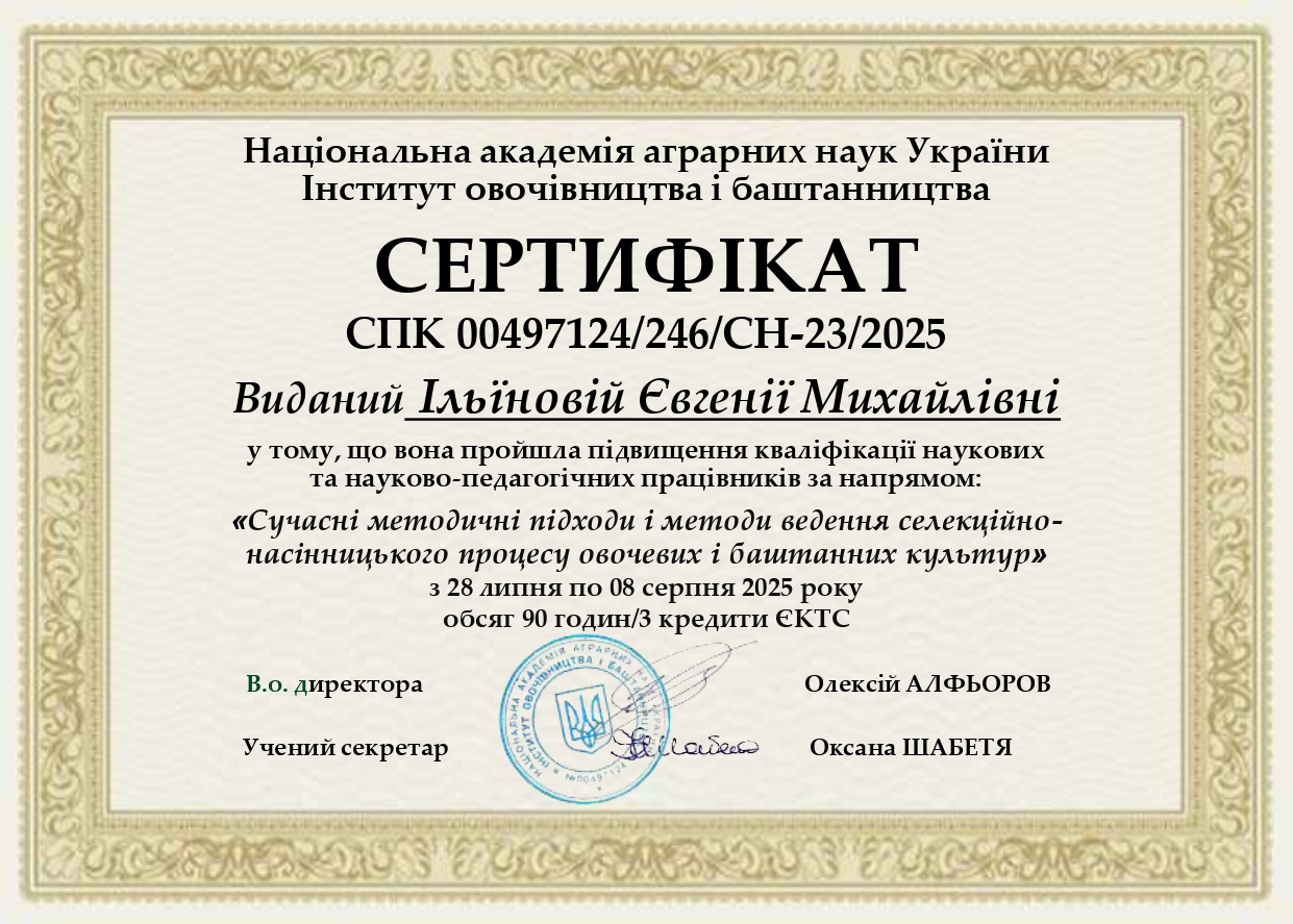 Ільїнова Євгенія МихайлівнаКандидат с.-г. наук за спеціальністю - овочівництво, старший науковий співробітник