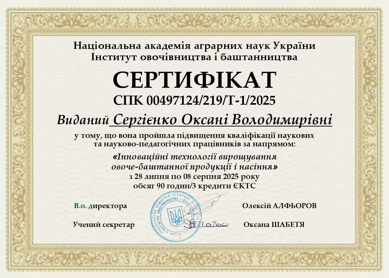 Сергієнко Оксана ВолодимирівнаДоктор с.-г. наук за спеціальністю - селекція і насінництво, старший науковий співробітник