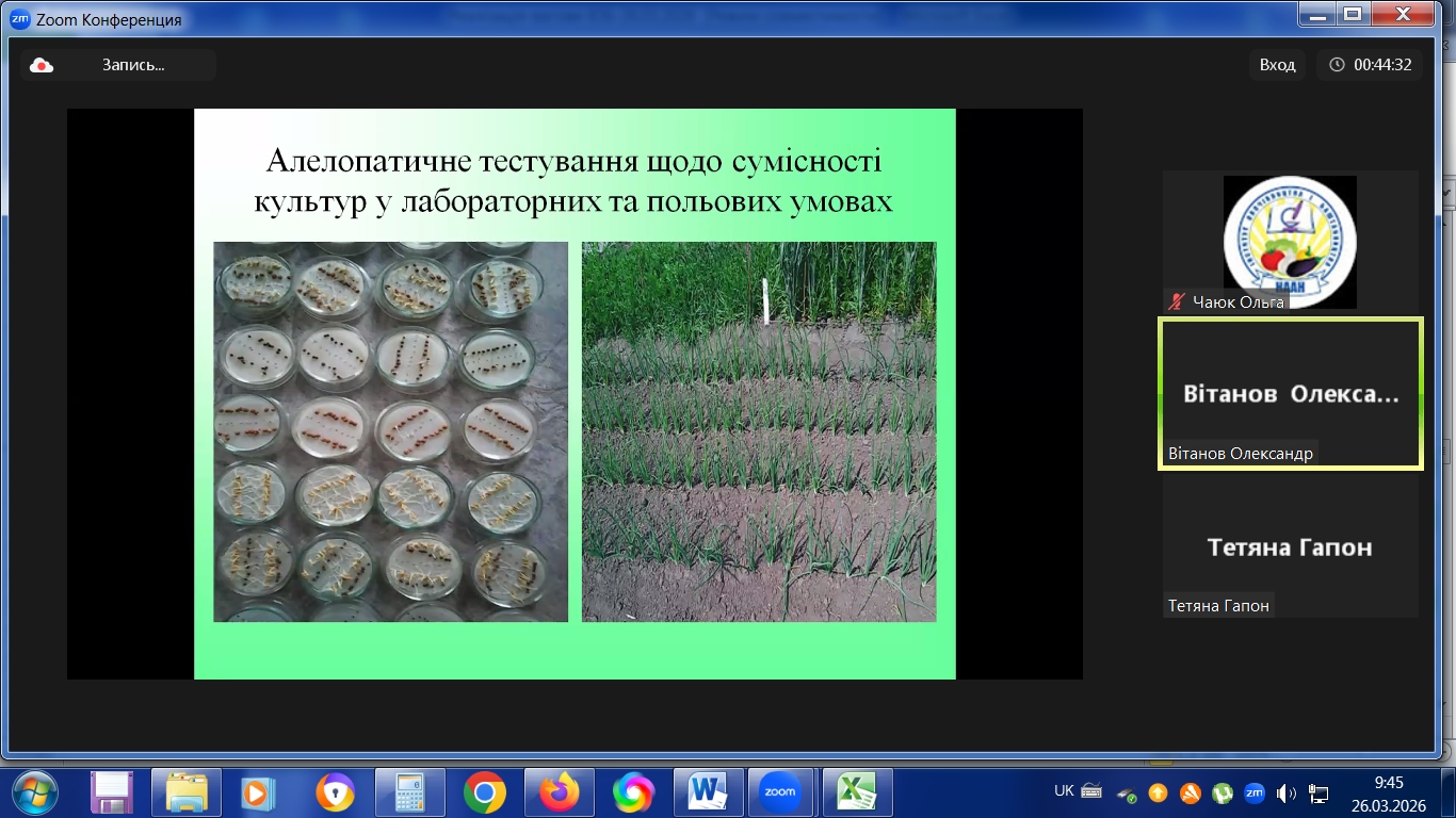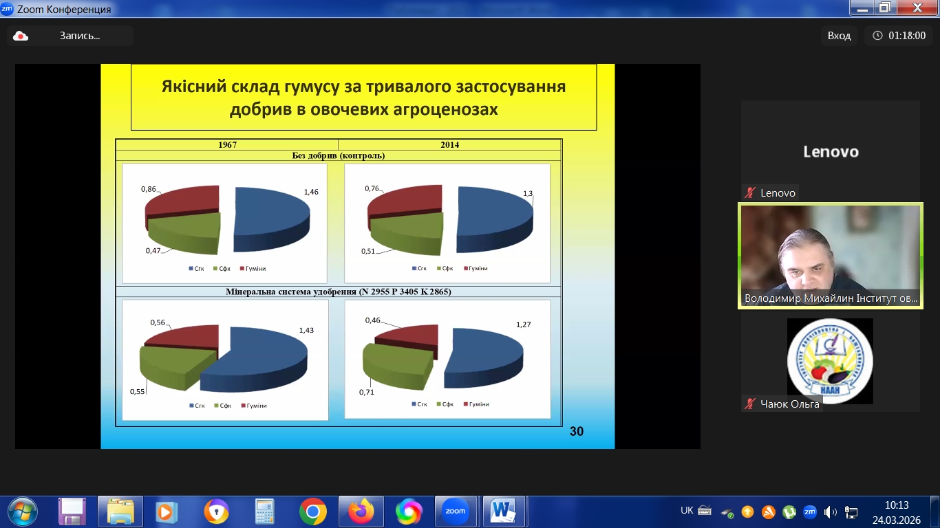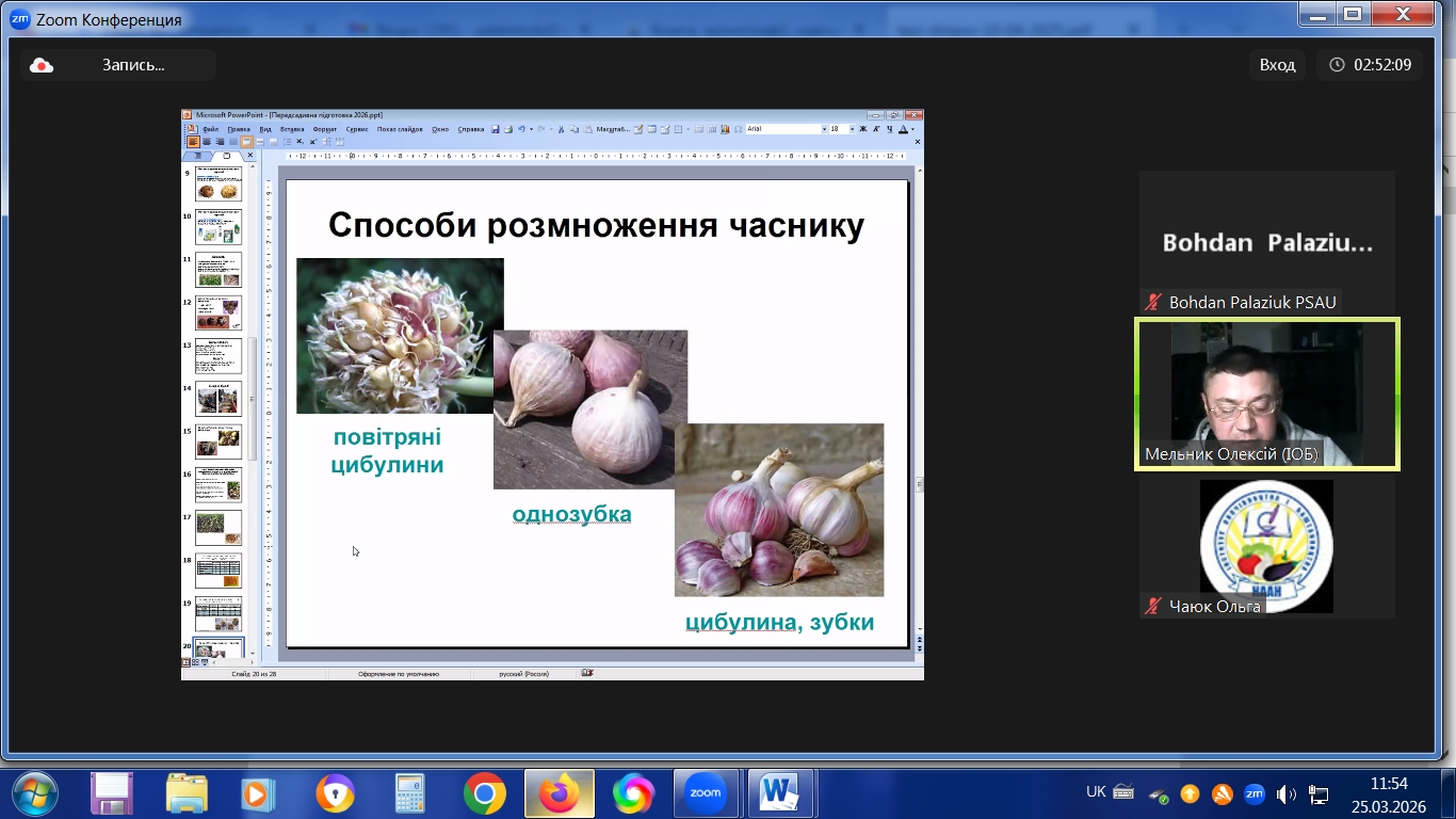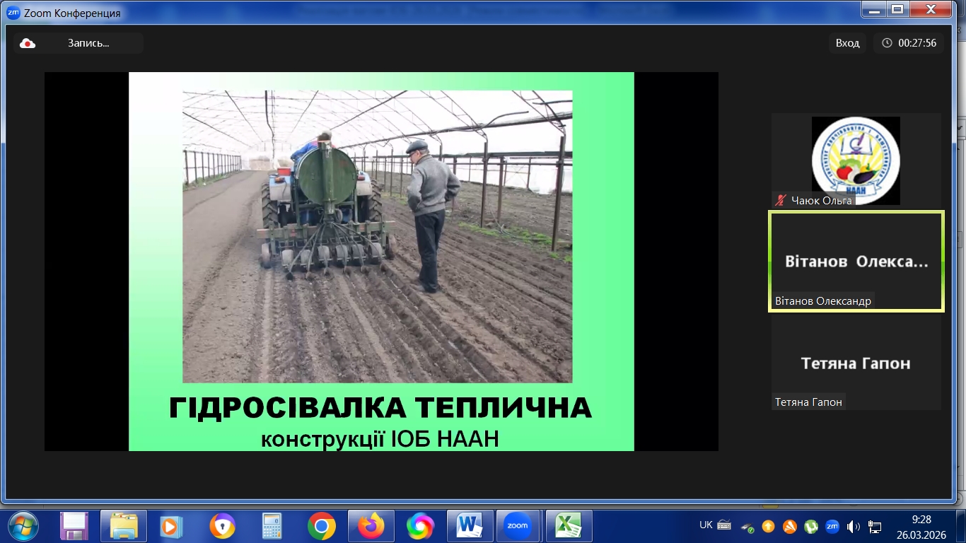 з 23.03.2026 р. по 27.03.2026 р. в режимі online в Інституті овочівництва і баштанництва НААН проходили курси підвищення кваліфікації наукових працівників установ НААН, науково-педагогічних та педагогічних працівників аграрних закладів вищої освіти, наукових співробітників інших установ, докторантів, аспірантів, здобувачів за спеціальністю Н1 – Агрономія, за напрямами: «Сучасні методологічні підходи і методи ведення селекційно-насінницького процесу овочевих і баштанних культур» 30 годин /1 кредит ЕКТS; «Інноваційні технології вирощування овоче-баштанної продукції і насіння» 30 годин /1 кредит ЕКТS.
